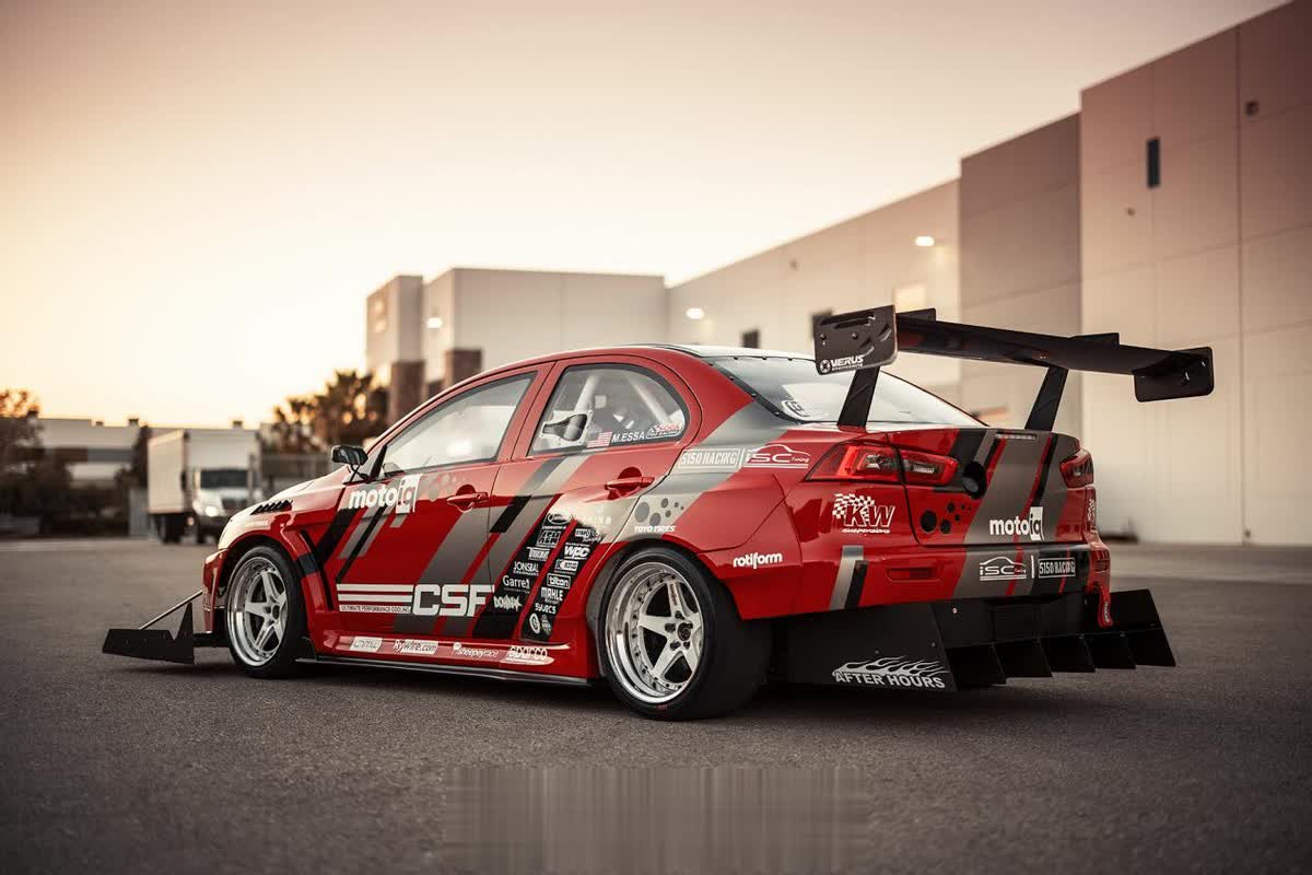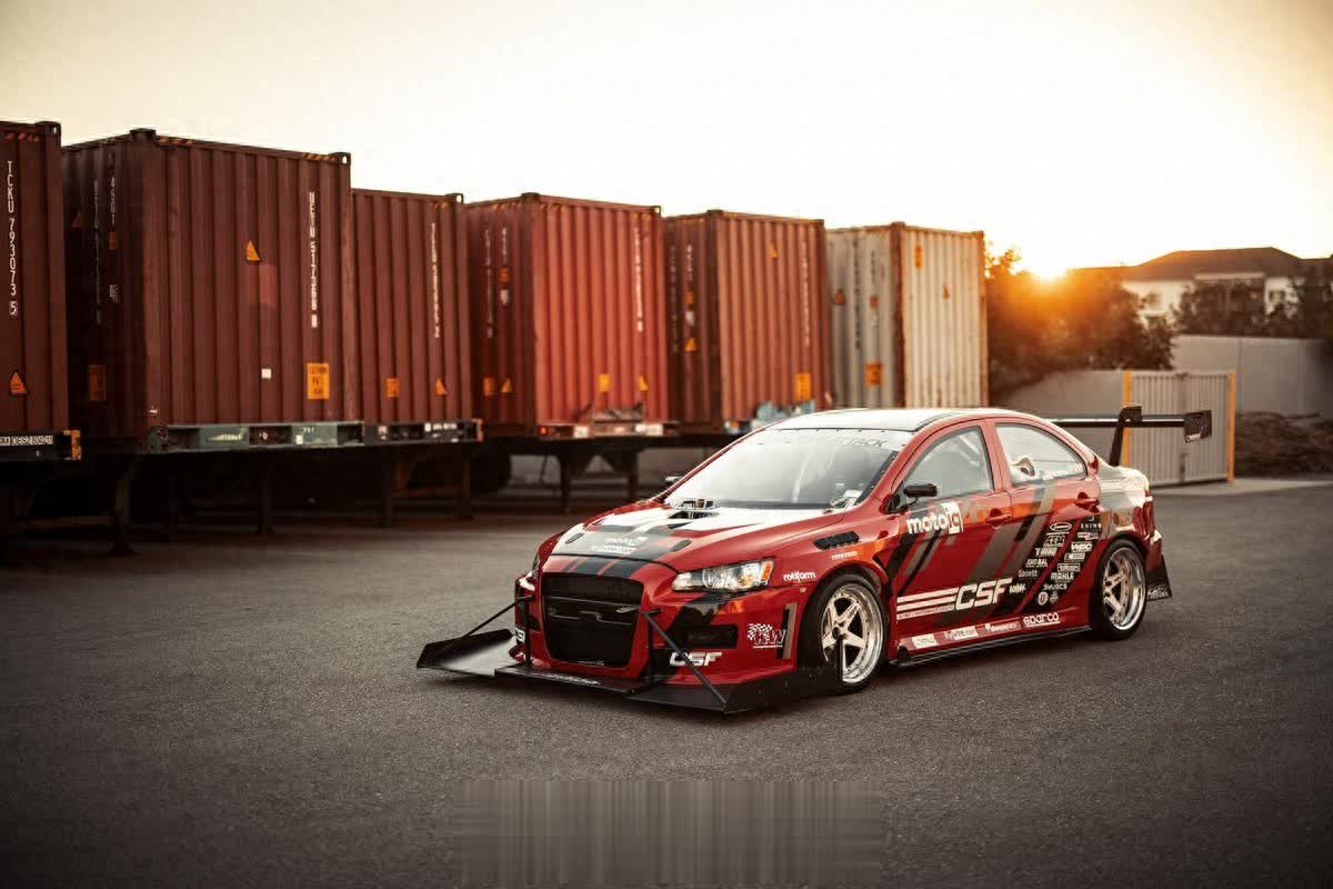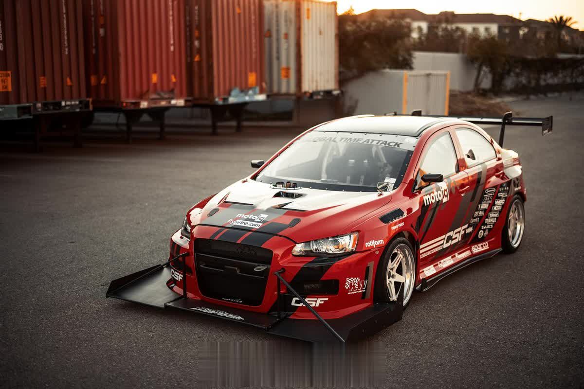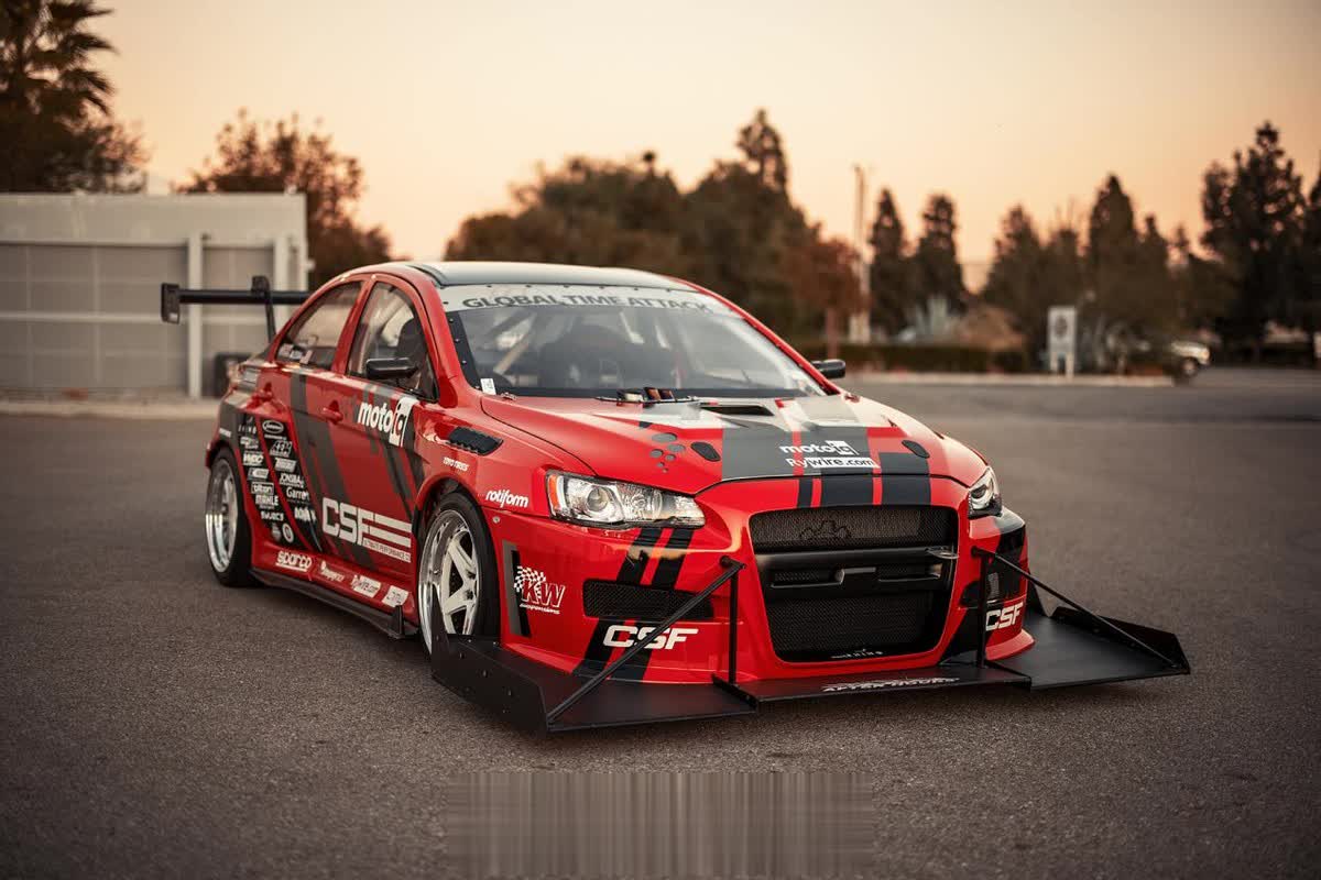 尽管在外观上还能看得出这是一台三菱EVO赛车,但是它的底子已经发生了巨大的变化。外观上,这辆EVO被打造成专门攻克赛道圈速的TimeAttack样式,除了定制的Streetfighter LA宽体套件以外,定制的超夸张前扰流和鹅颈大尾翼是车身最亮眼的地方。