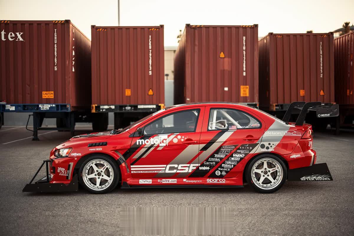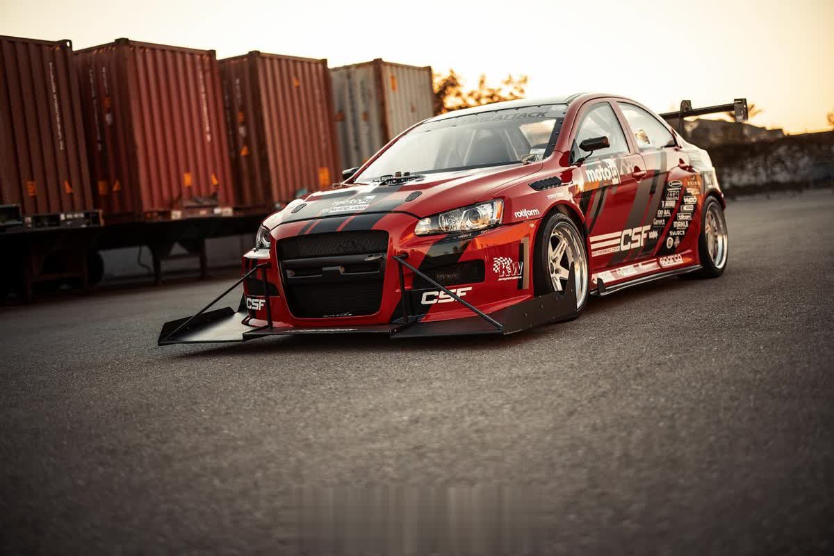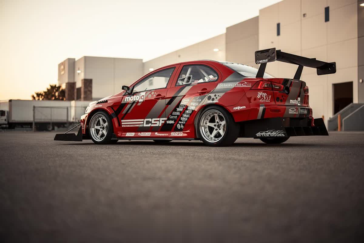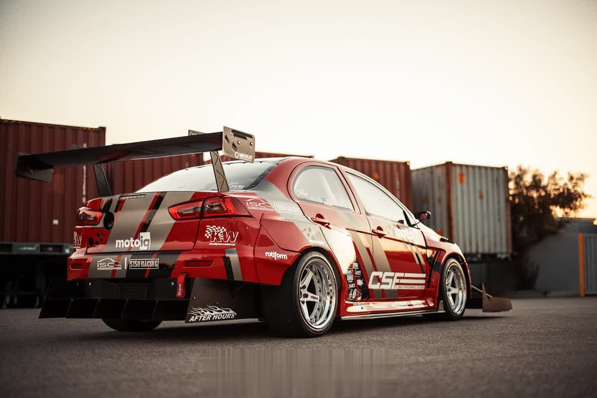 尽管在外观上还能看得出这是一台三菱EVO赛车,但是它的底子已经发生了巨大的变化。外观上,这辆EVO被打造成专门攻克赛道圈速的TimeAttack样式,除了定制的Streetfighter LA宽体套件以外,定制的超夸张前扰流和鹅颈大尾翼是车身最亮眼的地方。