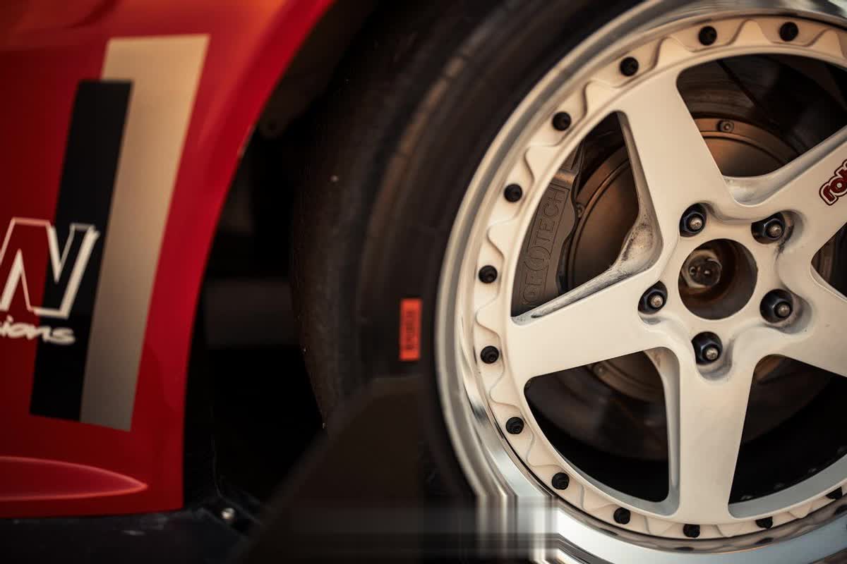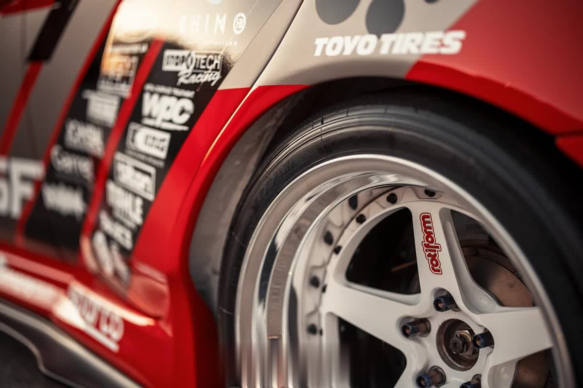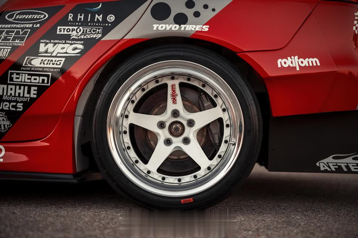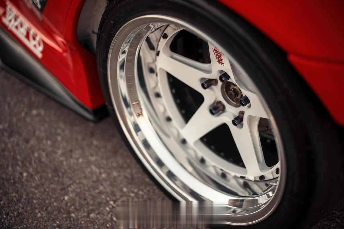 在安装了宽体翼子板以后,也换上夸张的18寸11J的Rotiform WGR轮毂,搭配一套东洋的RS1s轮胎,不过一台竞速的赛车居然搭配了一套大抛边的双片式轮毂,实力不得不让人怀疑?